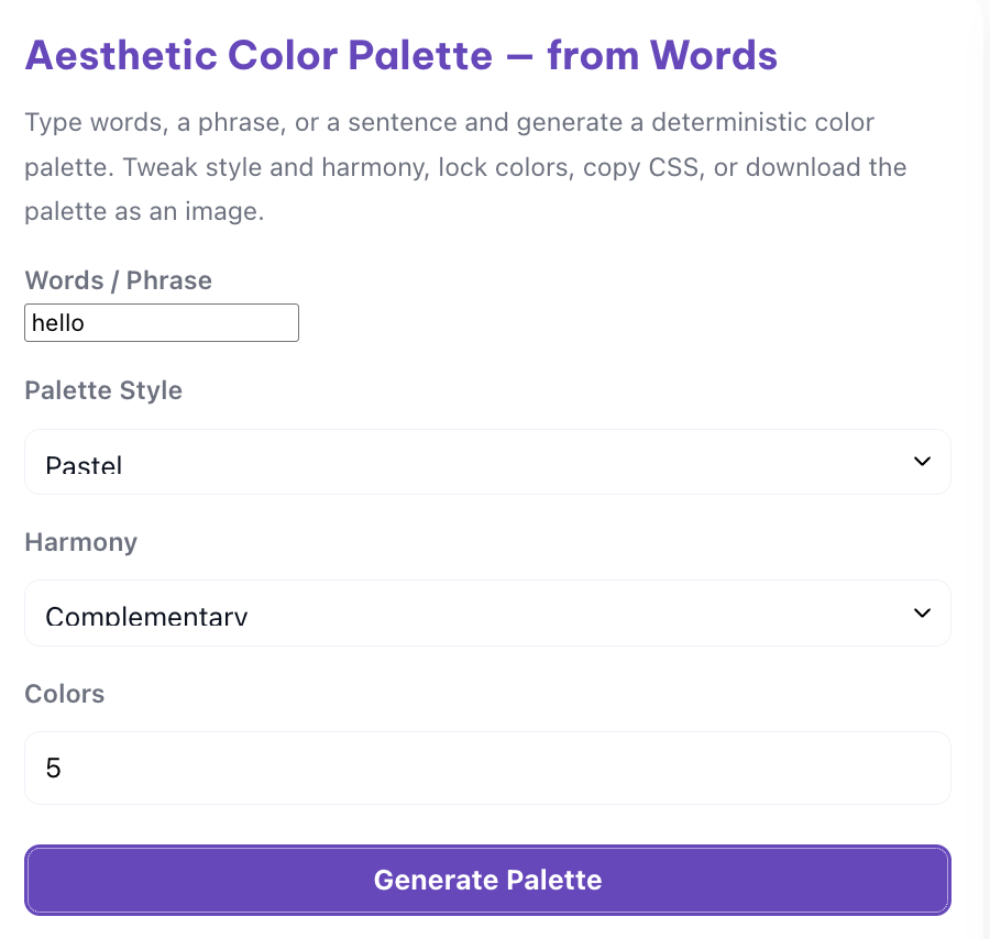 - It outputs a five-colour palette, complete with HEX and RGB values, that visually represents your phrase.