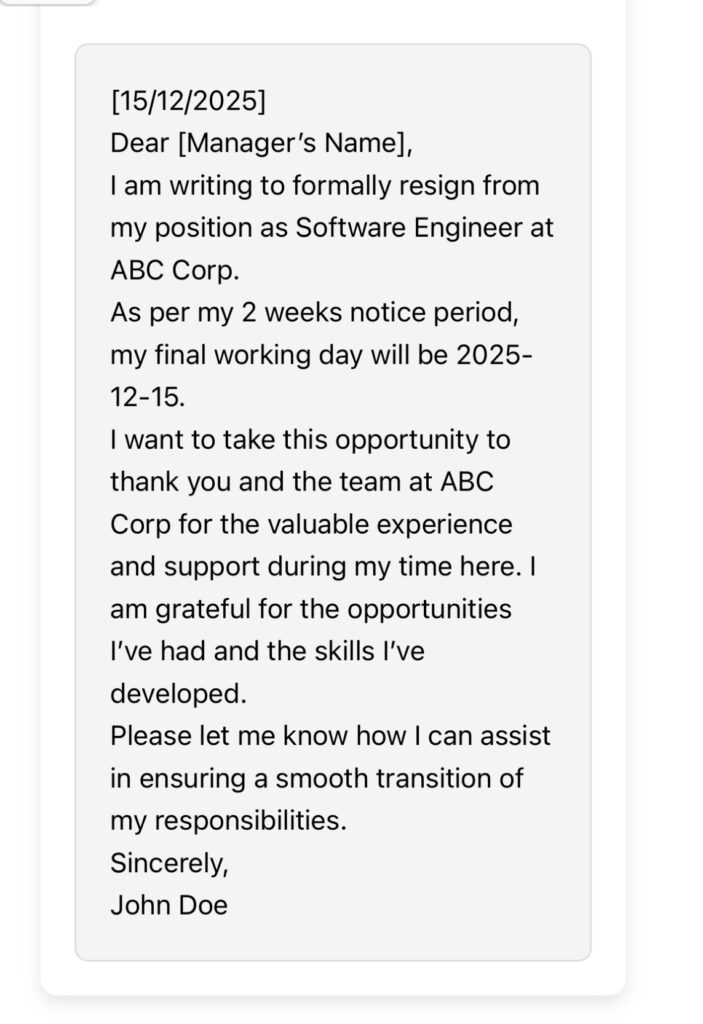 Example of a Generated Resignation Letter